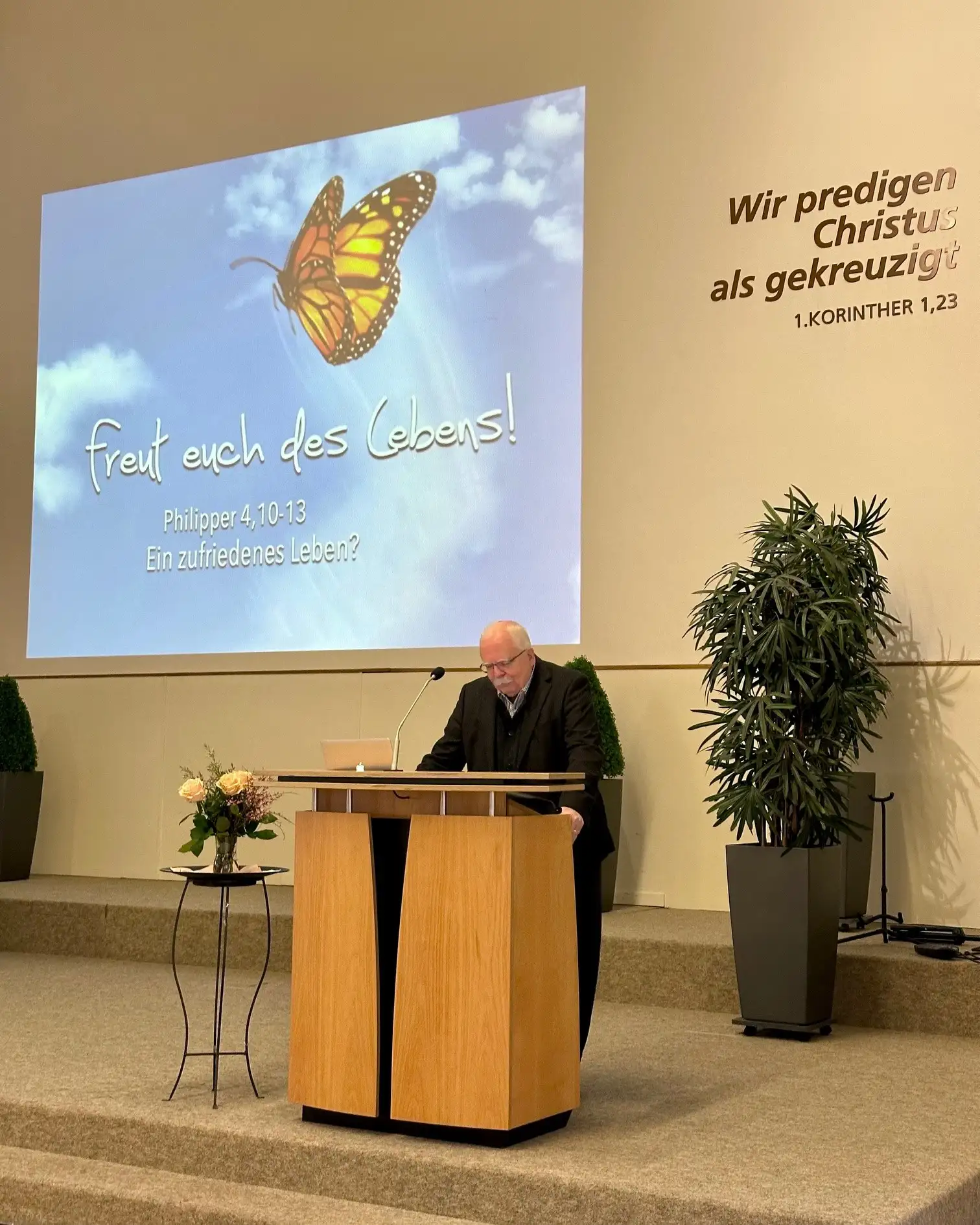 Wir sind eine Evangelisch-Freikirchliche Gemeinde, jeden Sonntag gibt’s Lobpreis und Abendmahl, danach eine Predigt.